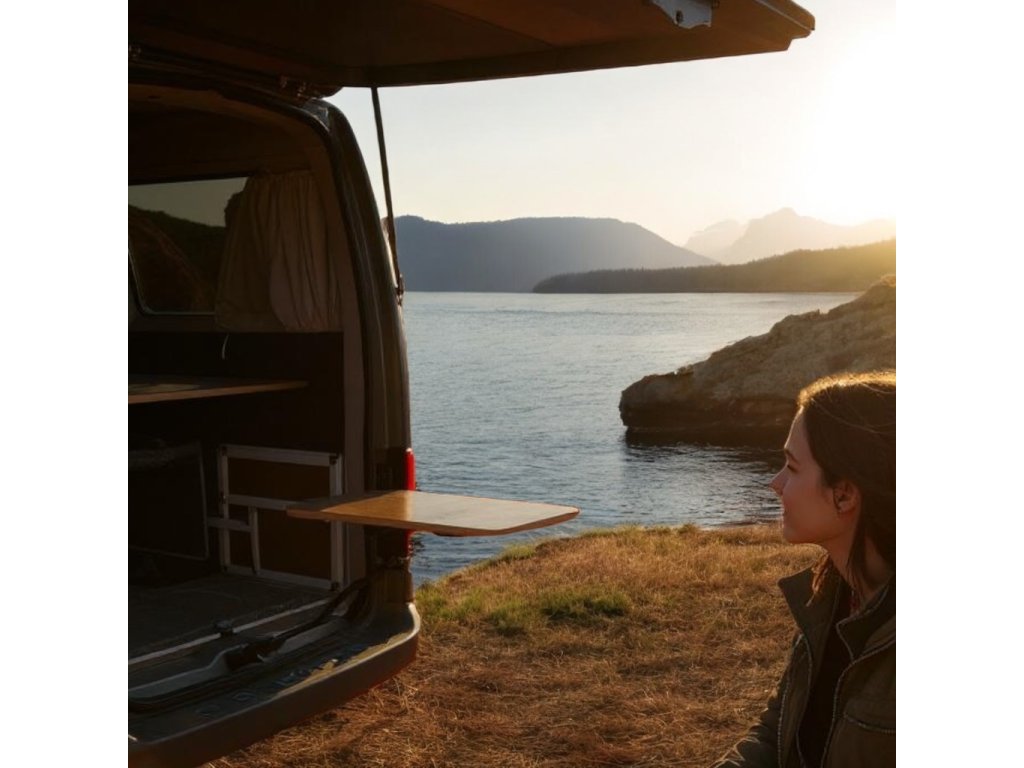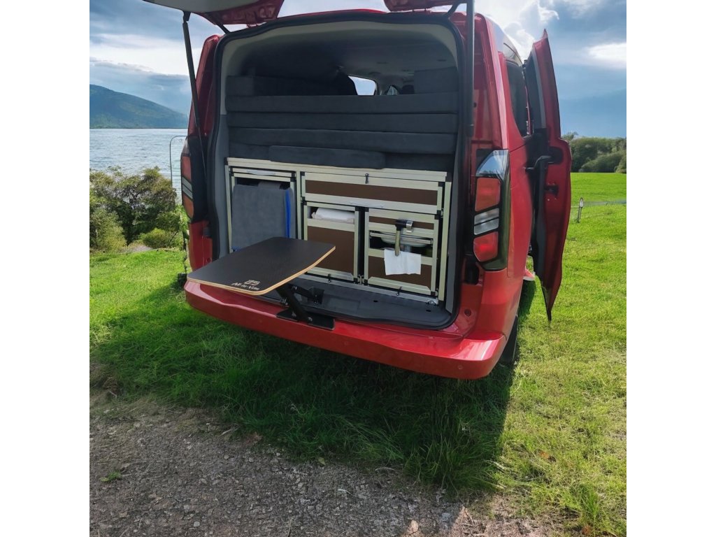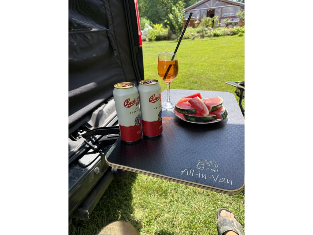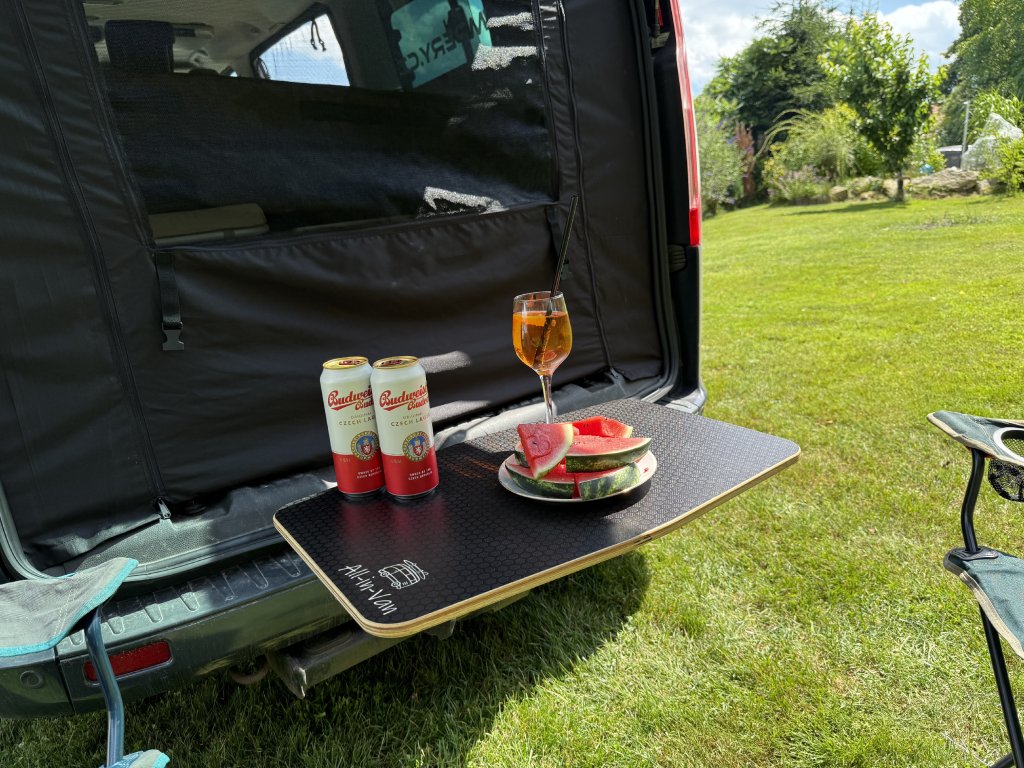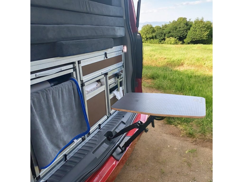 Campingový stolek Chilldesk by All-in-Van je kompaktní a multifunkční stolek, který se připevňuje na zadní dveře vozidla. Po vyklopení vytváří stabilní pracovní nebo jídelní plochu, kterou využijete při vaření, práci na notebooku i odpočinku v přírodě.