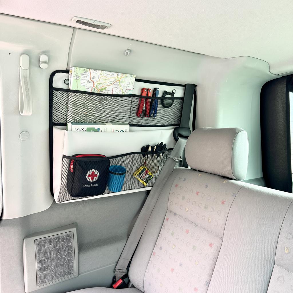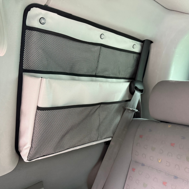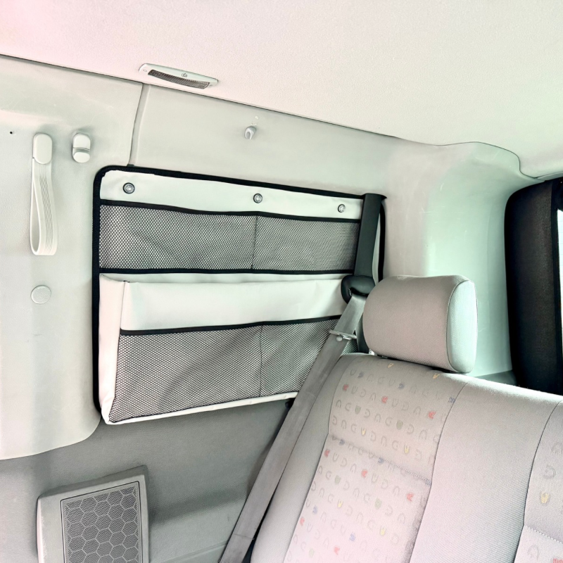 Pevný kapsář All-in-Van pro VW T4 Caravelle/Multivan vznikl speciálně pro pravou stranu třetí řady, kde je kvůli rozšířenému zadnímu sloupku menší vnitřní prostor okna. Konstrukce kapsáře počítá také s vedením bezpečnostního pásu, vše dokonale sedí a ladí s interiérem.