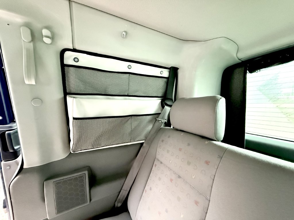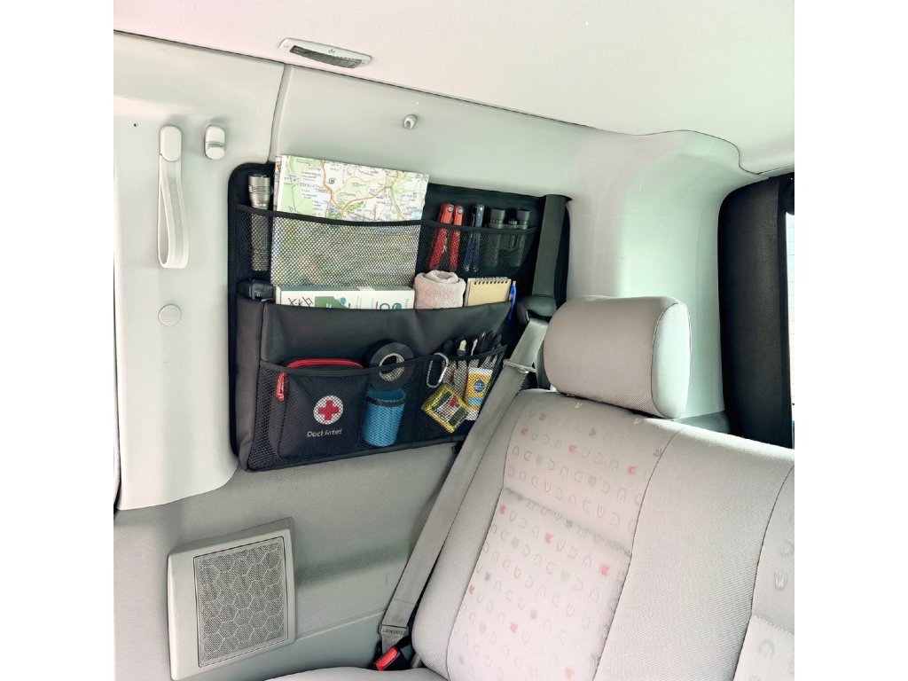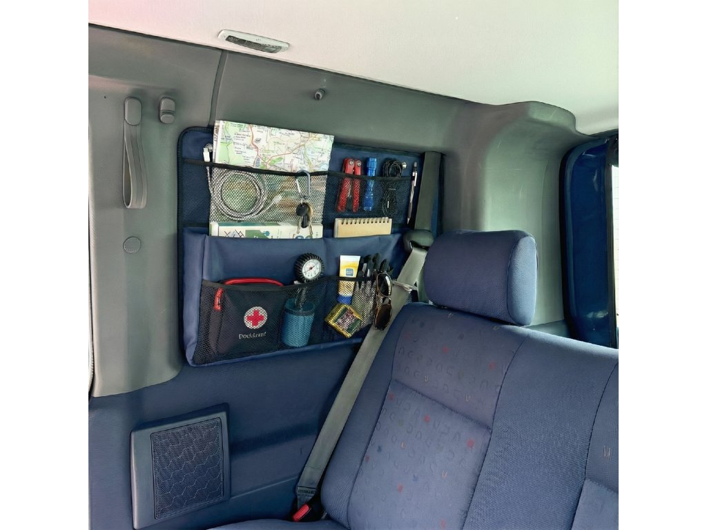 Pevný kapsář All-in-Van pro VW T4 Caravelle/Multivan vznikl speciálně pro pravou stranu třetí řady, kde je kvůli rozšířenému zadnímu sloupku menší vnitřní prostor okna. Konstrukce kapsáře počítá také s vedením bezpečnostního pásu, vše dokonale sedí a ladí s interiérem.