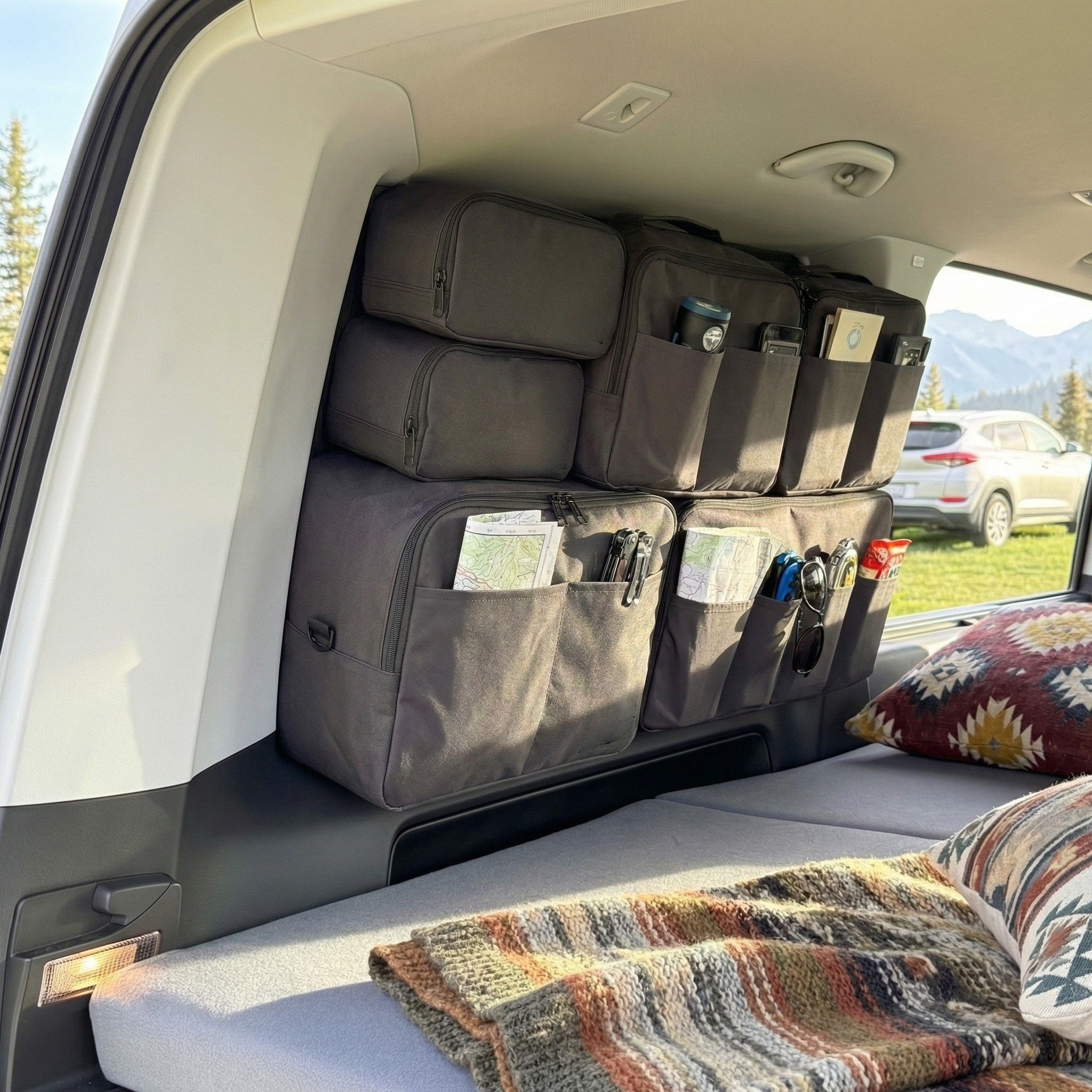 Každá kapsa má jasný účel a dohromady vytvářejí přehledný úložný systém, který využívá jinak obtížně dostupný prostor oken.