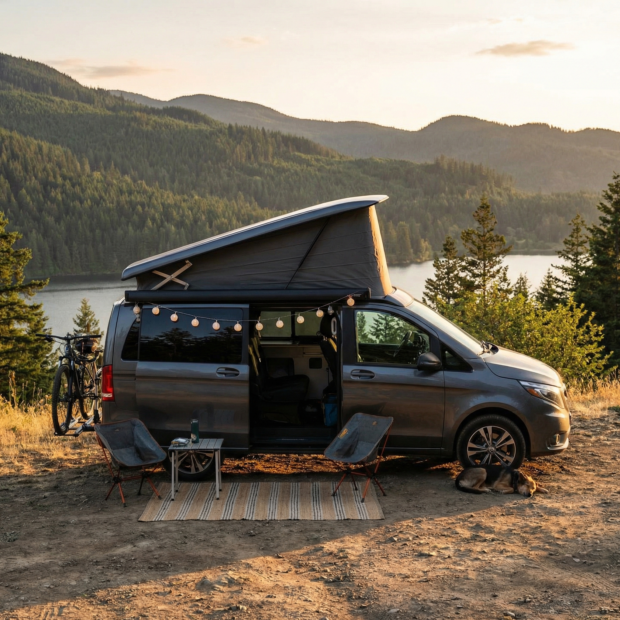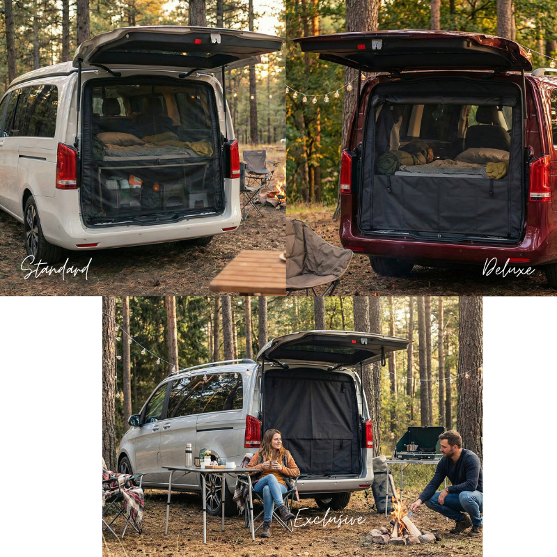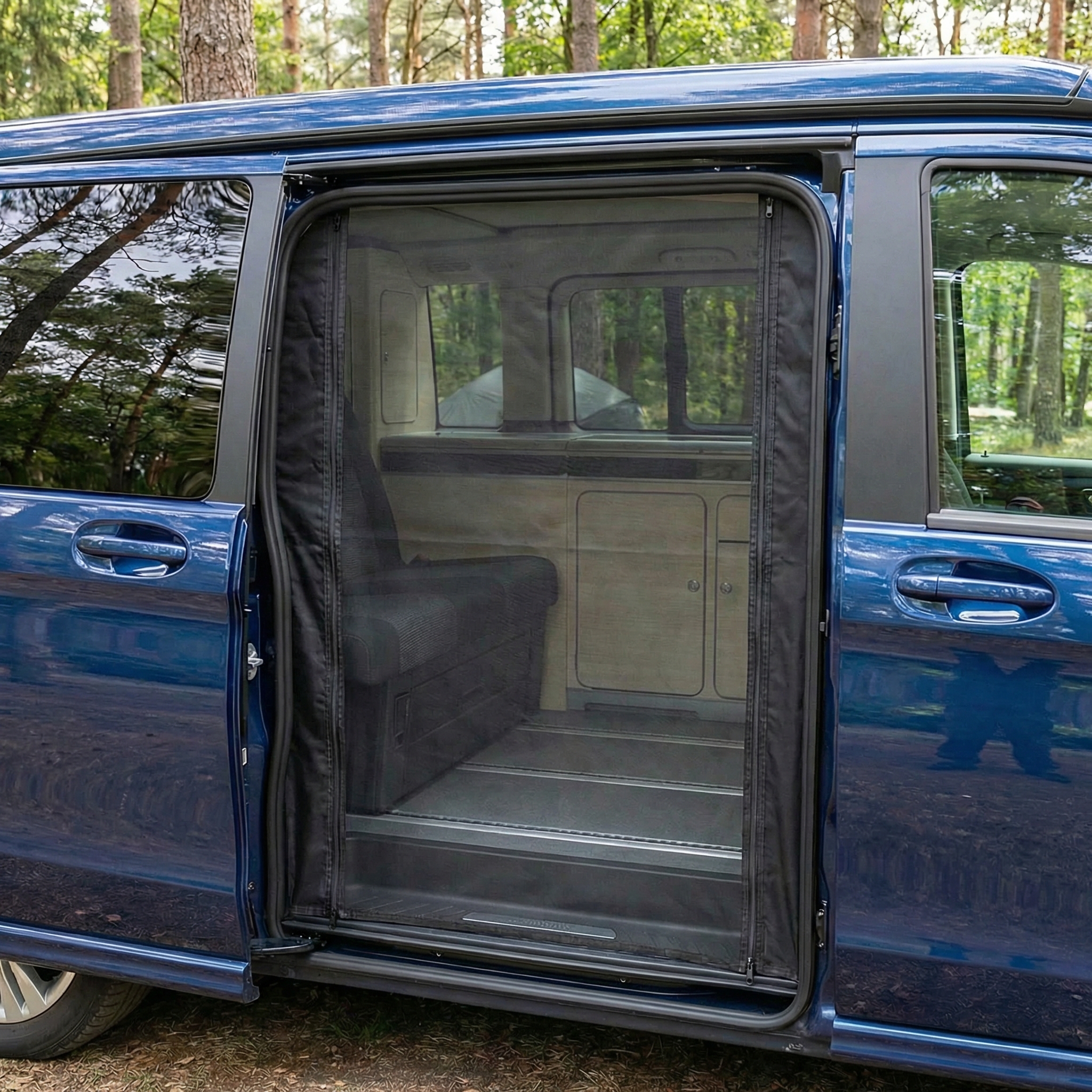 Modelová řada Mercedes-Benz třídy V: V-Class / Vito / Marco Polo (W447, 2014+) je častou volbou pro cestování, vestavby i komfortní spaní ve voze. Otevřené dveře zajišťují přirozené proudění vzduchu, zároveň ale vytváří prostor pro komáry a další hmyz.